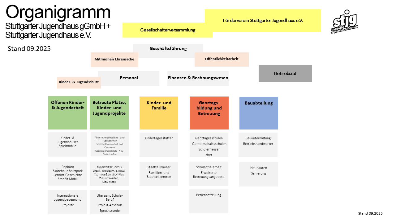 Bis zu unserem Rechtsformwechsel war die Stuttgarter Jugendhaus Gesellschaft (stjg) als Verein strukturiert. Seit 2006 sind wir eine gemeinnützige Gesellschaft. Unser Gesellschaftszweck ist die Förderung der Jugendhilfe, Bildung und Erziehung. Dem ursprünglichen Geschäftsbereich "Offene Kinder- und Jugendarbeit", der 1950 ausschlaggebend für den Namen unserer Organisation war, folgten mit den Geschäftsbereichen "Projekte & Übergang in den Beruf", "Ganztagesbildung und Betreuung mit Schulsozialarbeit" sowie "Kinder und Familie" weitere Arbeitsfelder.