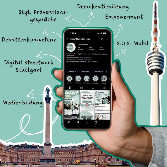 Eines unserer zentralen Projekte ist Digital Streetwork Stuttgart, gefördert vom Bundesprogramm „Demokratie leben!“. Wir begegnen Jugendlichen dort, wo sie online unterwegs sind. Auf Social Media unterstützen unsere Digital Streetworker*innen sie dabei, digitale Kommunikation zu verstehen, Desinformation und Hetze zu durchschauen und für eine faire Diskussionskultur einzustehen.