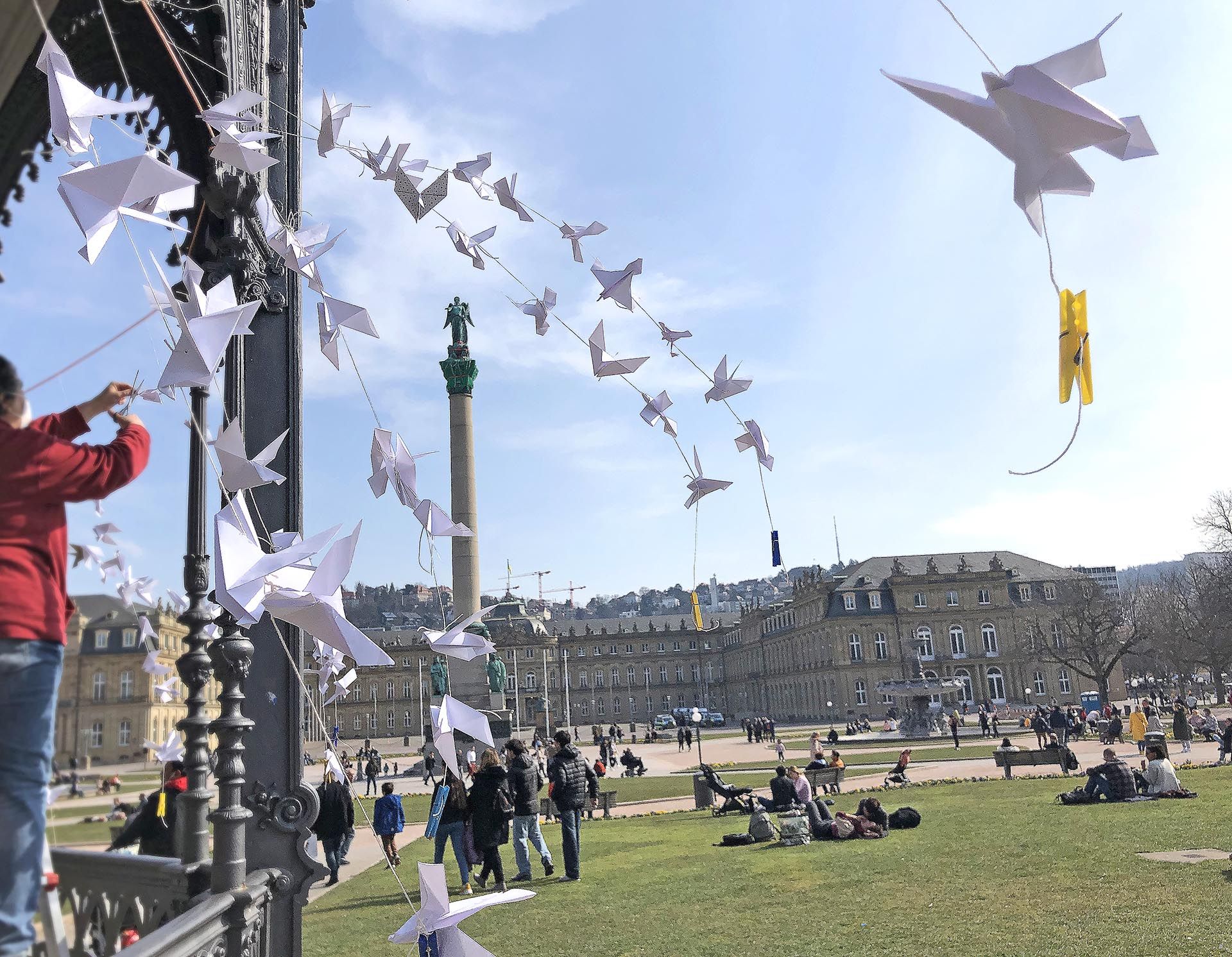 Hunderte kleine, weiße Friedenstauben aus Papier hingen an Fäden rund um den Musik-Pavillon vor dem Stuttgarter Königsbau. Wenn der Wind wehte, schien es, als würden sie fliegen. Unter der Kuppel des Pavillons kamen immer wieder Menschen zusammen, um das Friedenssymbol aus quadratischem Papier zu falten, so, wie die achtjährige Havim.
